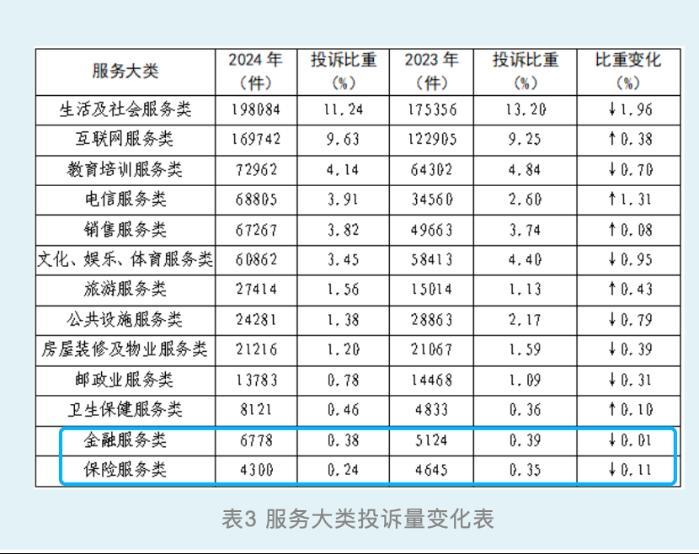 值得注意的是,在严监管态势下,金融、保险领域的投诉占比已有一定下降。2024年全年,全国消协组织共受理消费者投诉176.1886万件,同比增长32.62%,其中,金融服务类投诉共计6778件,占总投诉量的比重为0.38%,占比较2023年下降0.01个百分点,投诉量同比增加32.28%;保险服务类投诉共计4300件,占比为0.24%,同比减少7.43%。
